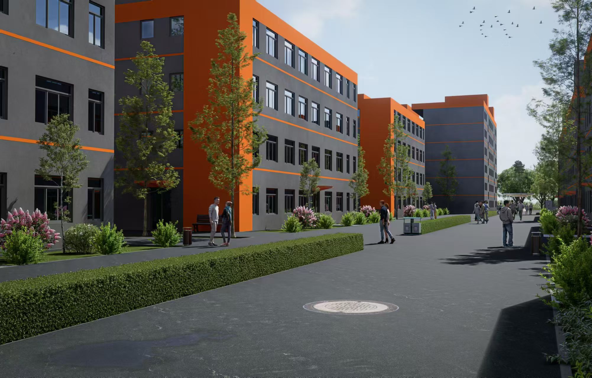 园区总建筑面积约8万平方米,设有研发、生产、生活配套等功能区,包括19栋四层厂房、8栋人才公寓。